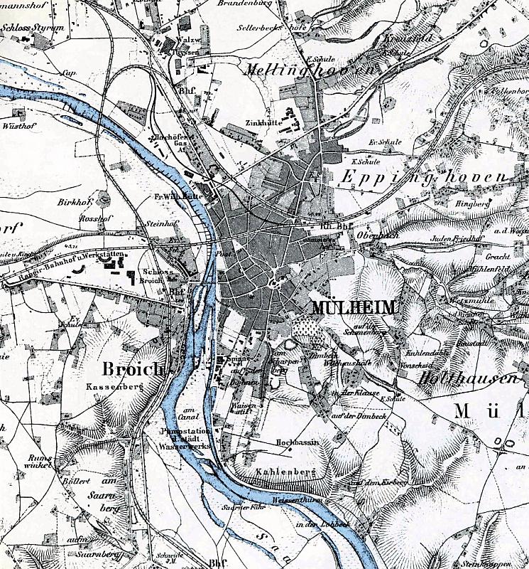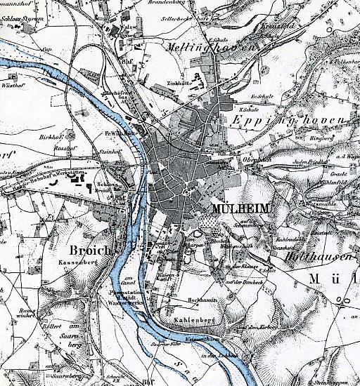 • Karte der Stadt um 1880 - Von Geometer A. Hofacker - Stadtarchiv Mülheim; transfered from German Wikipedia